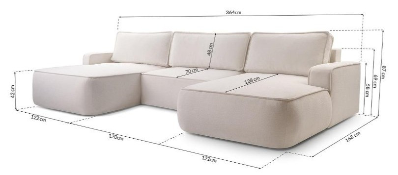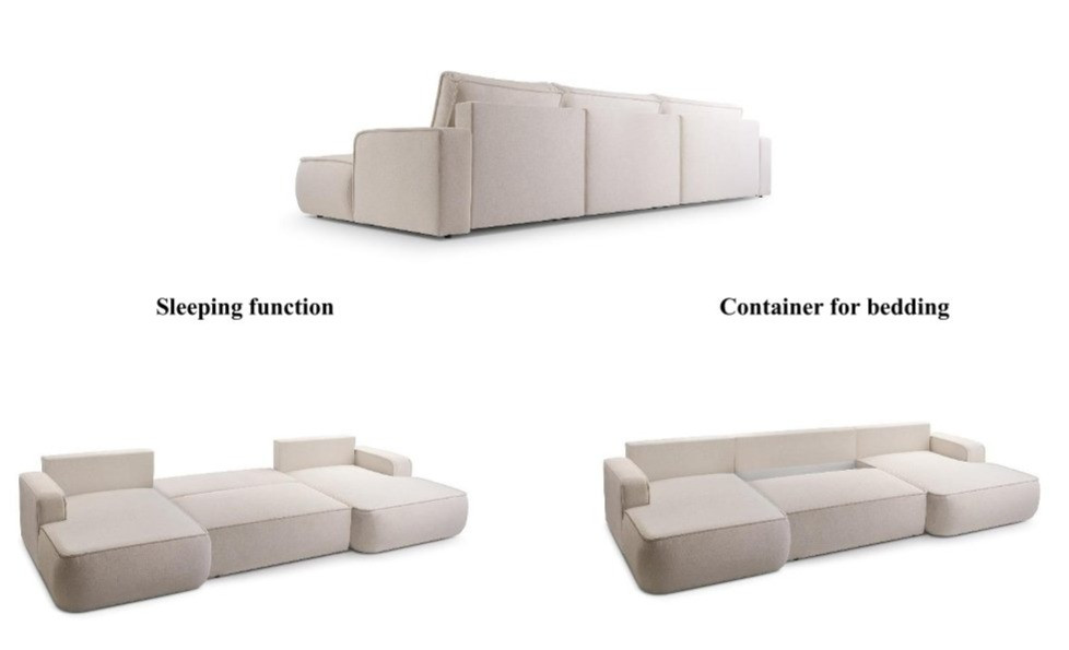 Az U alakú kialakítás több személy számára biztosít kényelmes helyet, legyen szó családi együttlétekről, baráti beszélgetésekről vagy hosszabb pihenésről. A puha párnázás és a széles chaise longue gondoskodik a kellemes komfortérzetről, míg az alvásfunkció és a beépített ágyneműtartó a mindennapok praktikumát erősíti.